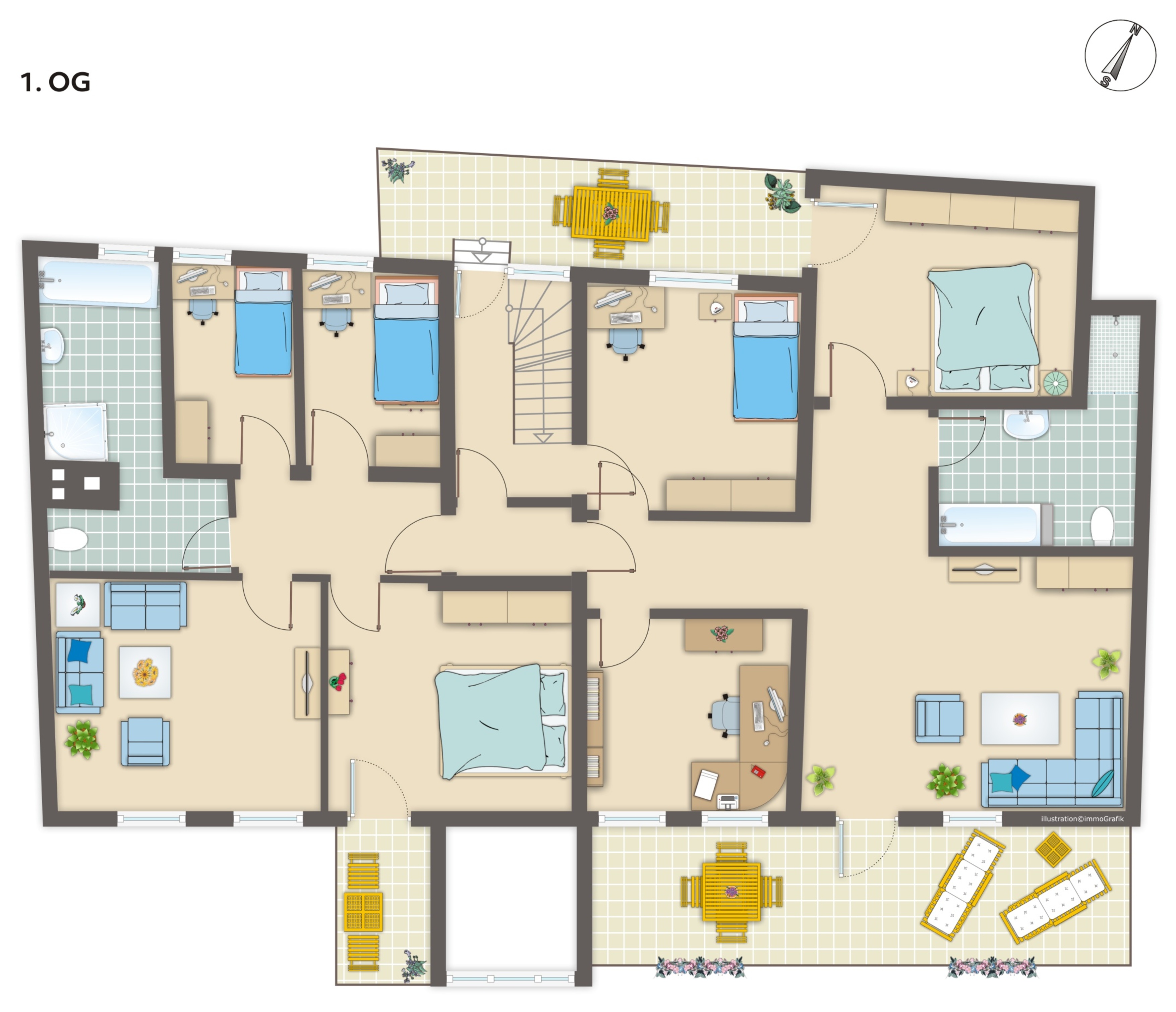 Im 1. OG des Gebäudes befinden sich zum einen eine große 4-Zimmer-Wohnung mit Terrasse sowie eine kleinere 4-Zimmer-Wohnung mit kleiner Loggia. Beide Wohnungen verfügen über ein Badezimmer mit Dusche, Badewanne sowie Waschtisch und WC. Wenn das neue Treppenhaus fertiggestellt ist, besteht die Möglichkeit die beiden Wohnungen zusammenzuführen.