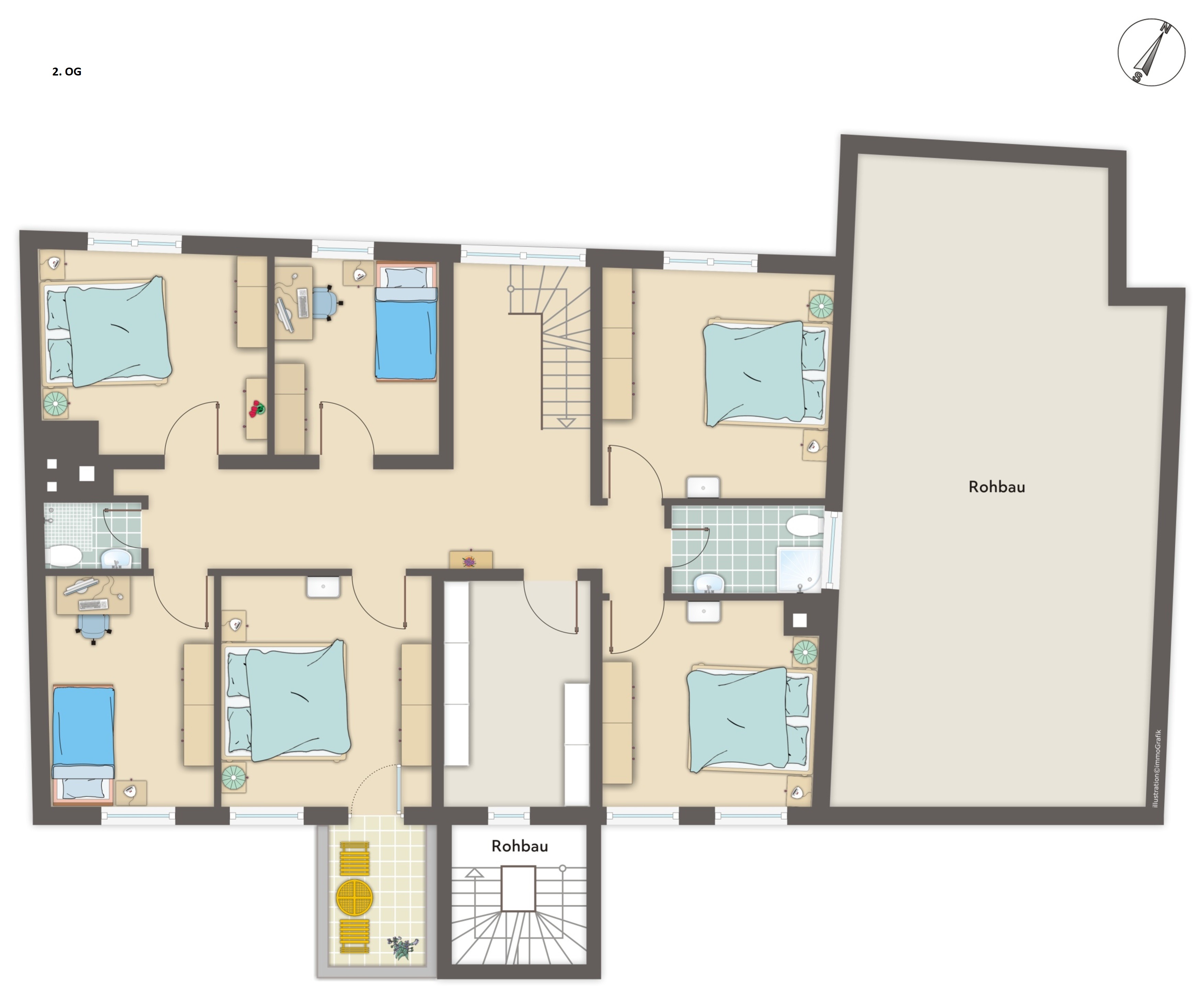 im 2. OG befinden sich die Fremdenzimmer - 4 Doppelzimmer, 2 Einzelzimmer sowie ein Lagerraum. Auf dieser Etage gibt es 2 Bäder. Einige der Zimmer verfügen über ein Waschbecken im Zimmer.