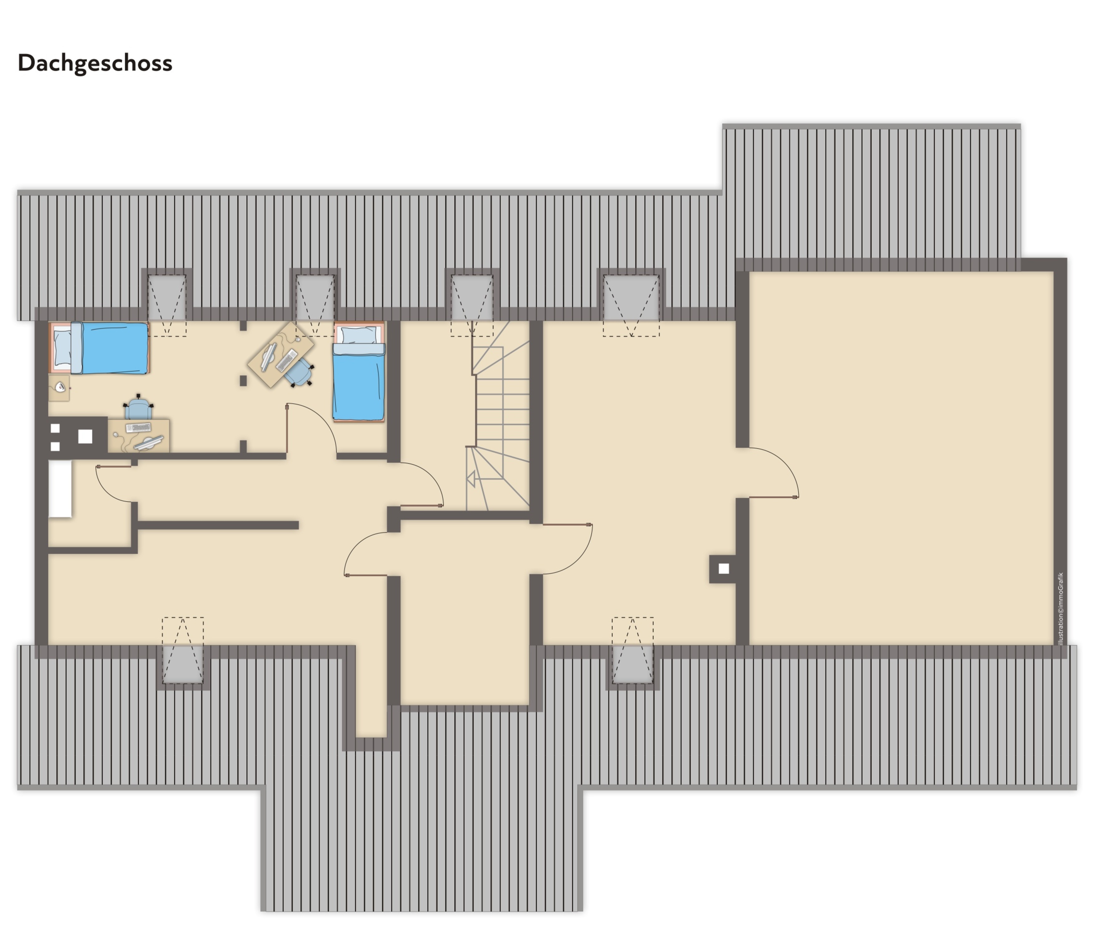 Das Dachgeschoß hat ein weitere Gästezimmer sowie ein Badezimmer. Zudem hat das Dachgeschoß einen Bühnenraum der als Lagerfläche dient. Ein weiteres Zimmer befindet sich im Rohbau.