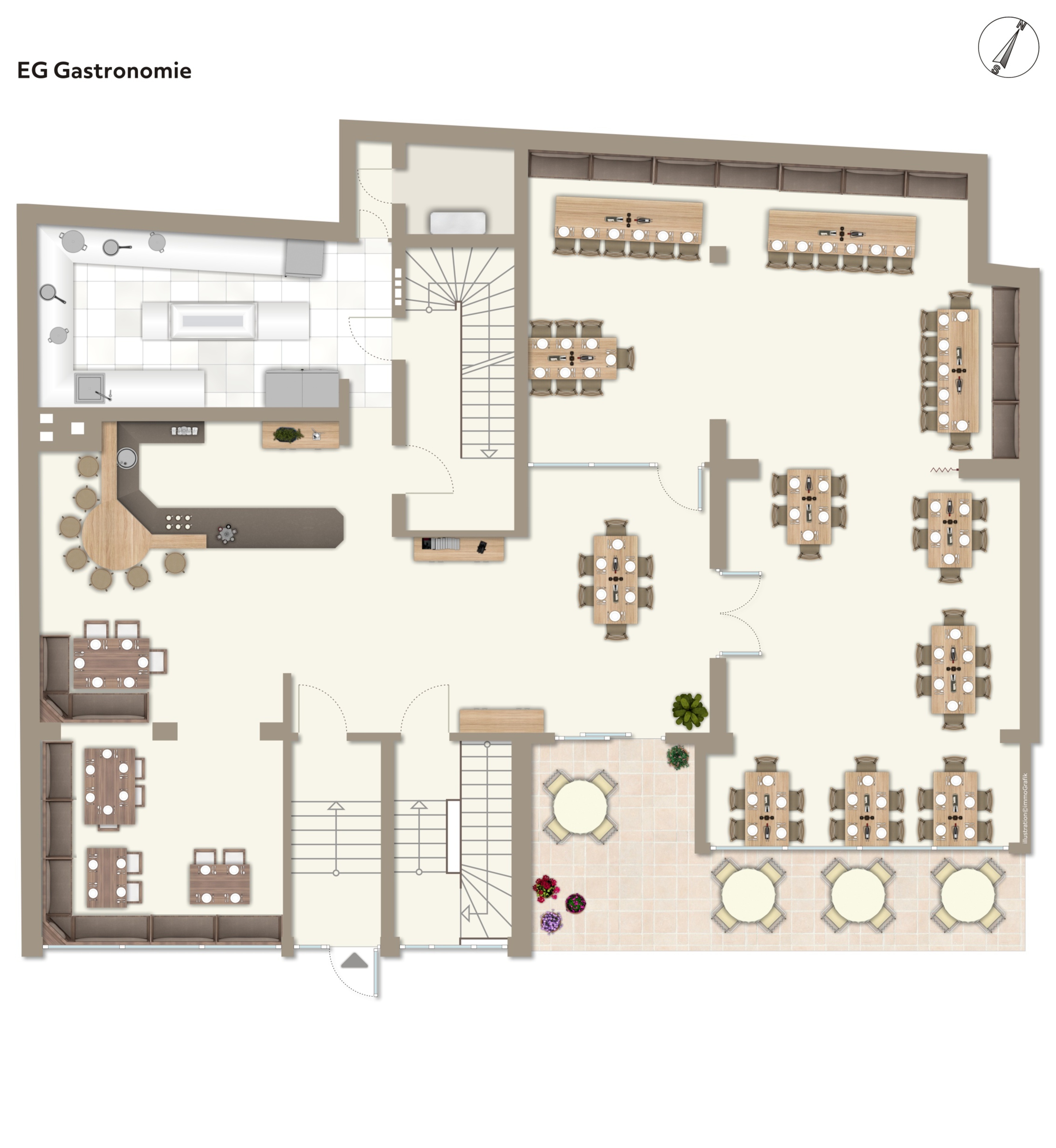 Der Bewirtungsbereich besteht aus einem großen Raum mit Bar/ Theke, einem abgetrennten Nebenraum sowie der Möglichkeit einen weiteren Nebenraum zu schaffen und einer wunderschönen Terrasse.